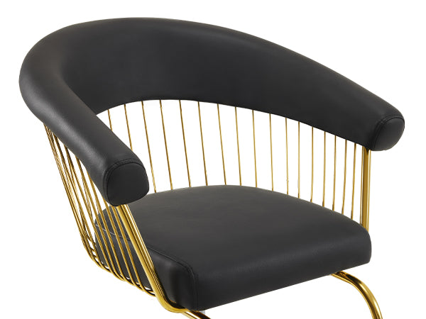 This stylish salon chair exudes elegance and modernity. The comfortable high-density foam cushion is wrapped in smooth black or champagne-colored leather, paired with a gold iron frame, making it both eye-catching and durable. Whether in a high-end hair salon, a luxury barbershop, or a trendy beauty salon, this chair seamlessly integrates into its environment, providing customers with a luxurious and comfortable experience while elevating the overall ambiance of the space.