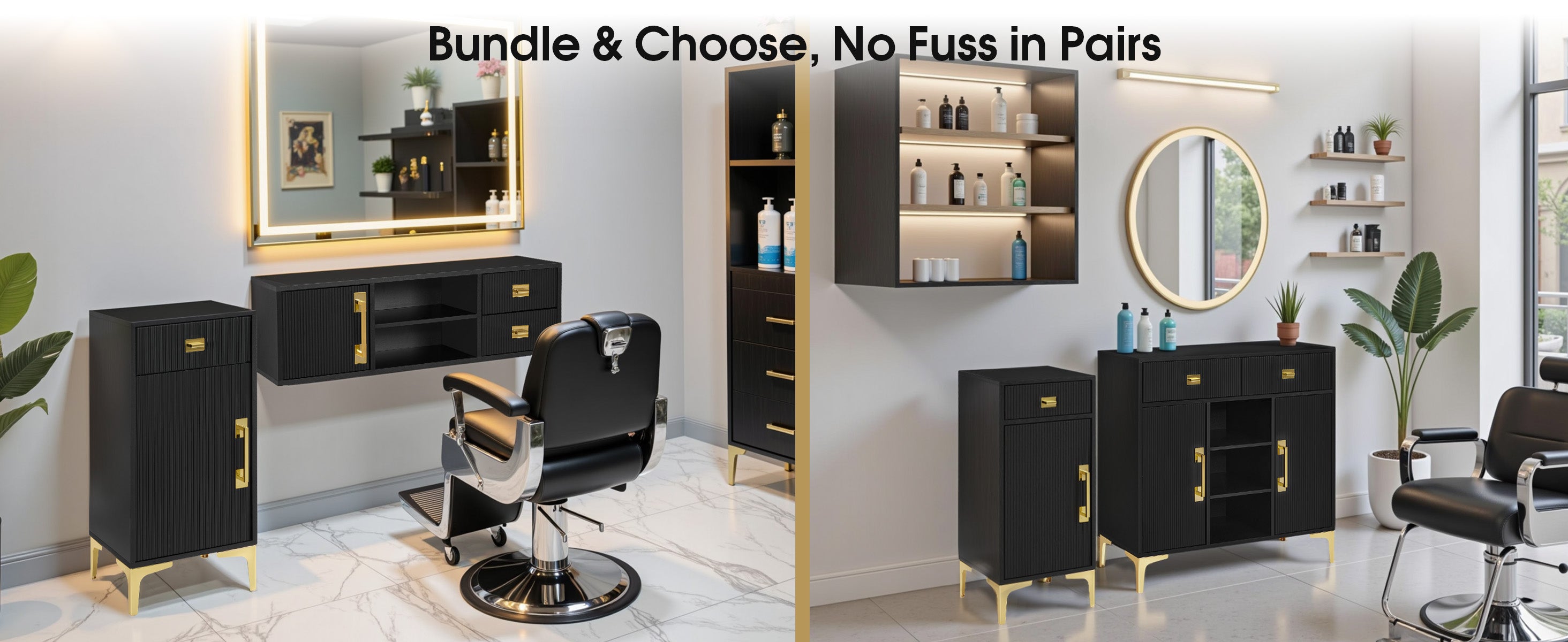 This multifunctional salon station pairs ample storage with a refined design, making it perfect for salons, studios, and modern professional spaces. Featuring generous compartments, adjustable shelving, and an anti-tip safety system, it delivers both practicality and security. The black finish with golden accents and fluted textures adds a touch of elegance to any environment.