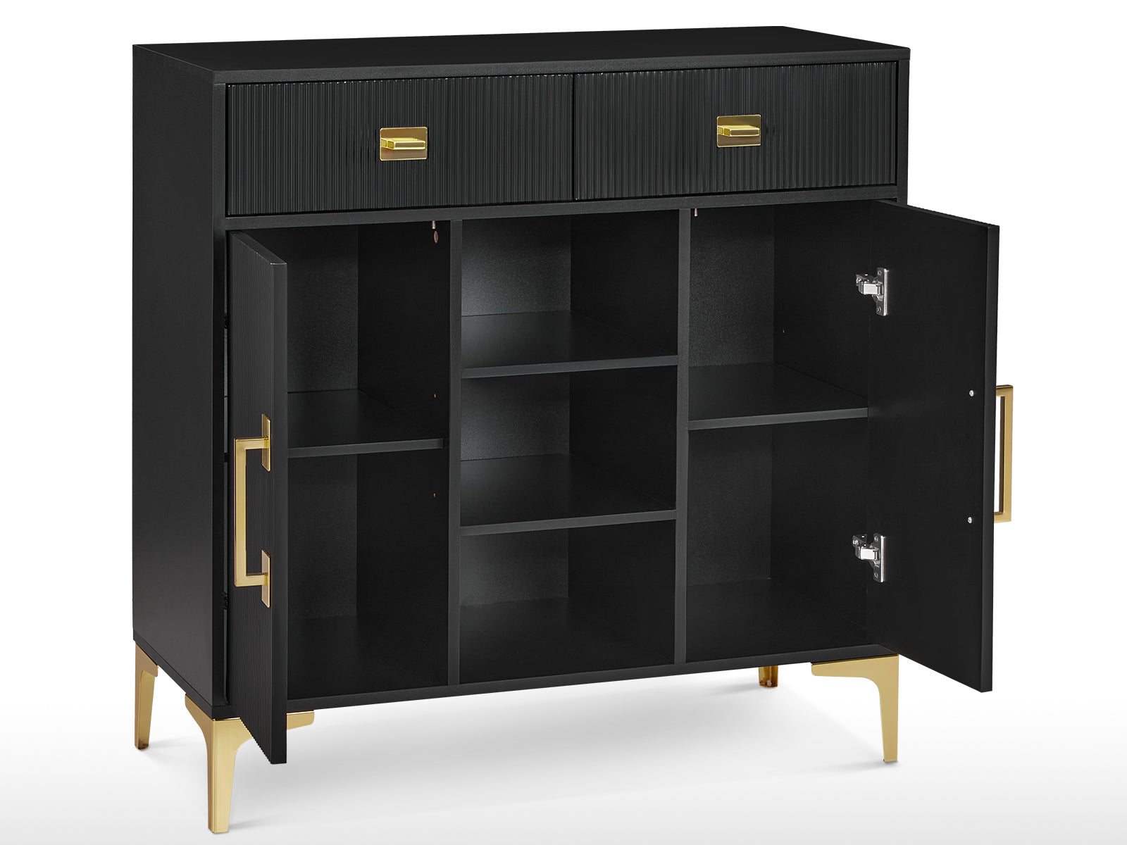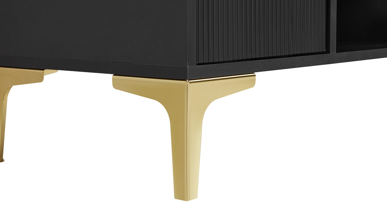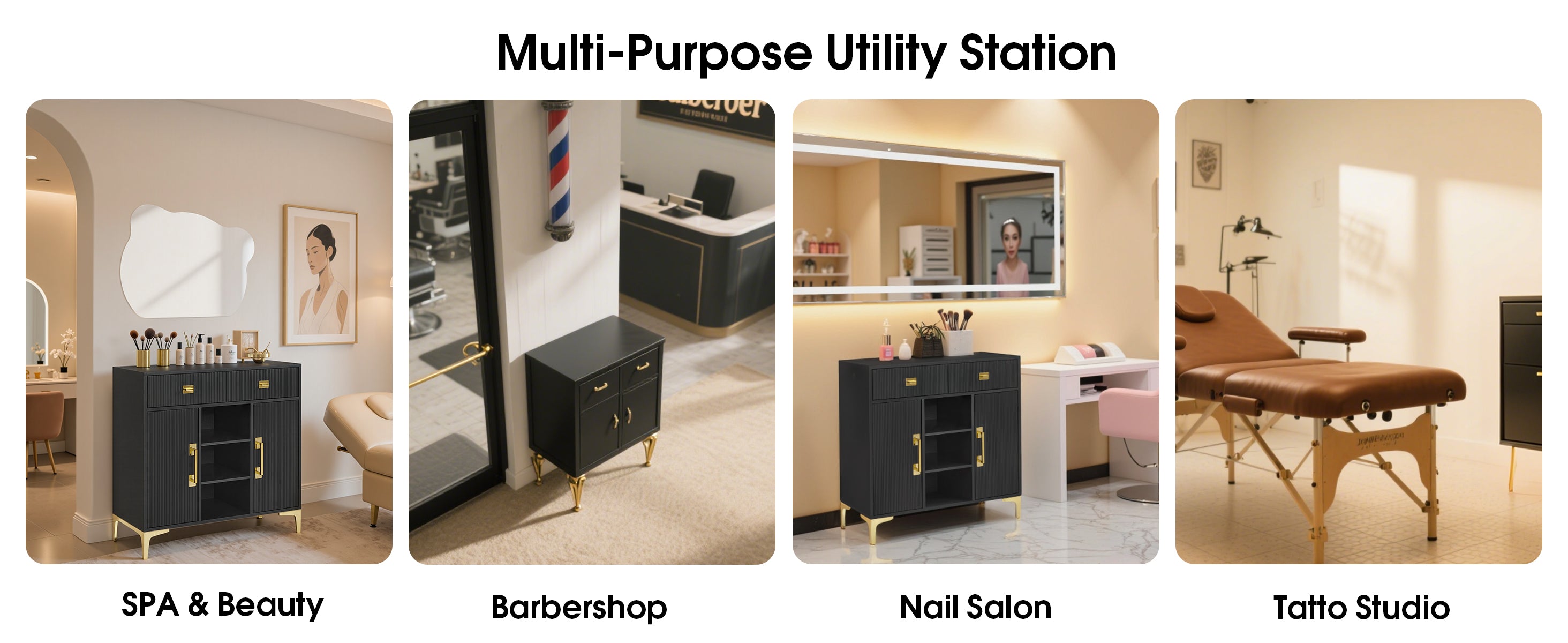 This multifunctional tool station blends practical storage with stylish design, making it ideal for salons, studios, or modern workspaces. With its spacious compartments, adjustable shelving, and anti-tip safety feature, it offers both functionality and peace of mind. The sleek black finish paired with gold accents and fluted detailing adds a touch of sophistication to any environment.