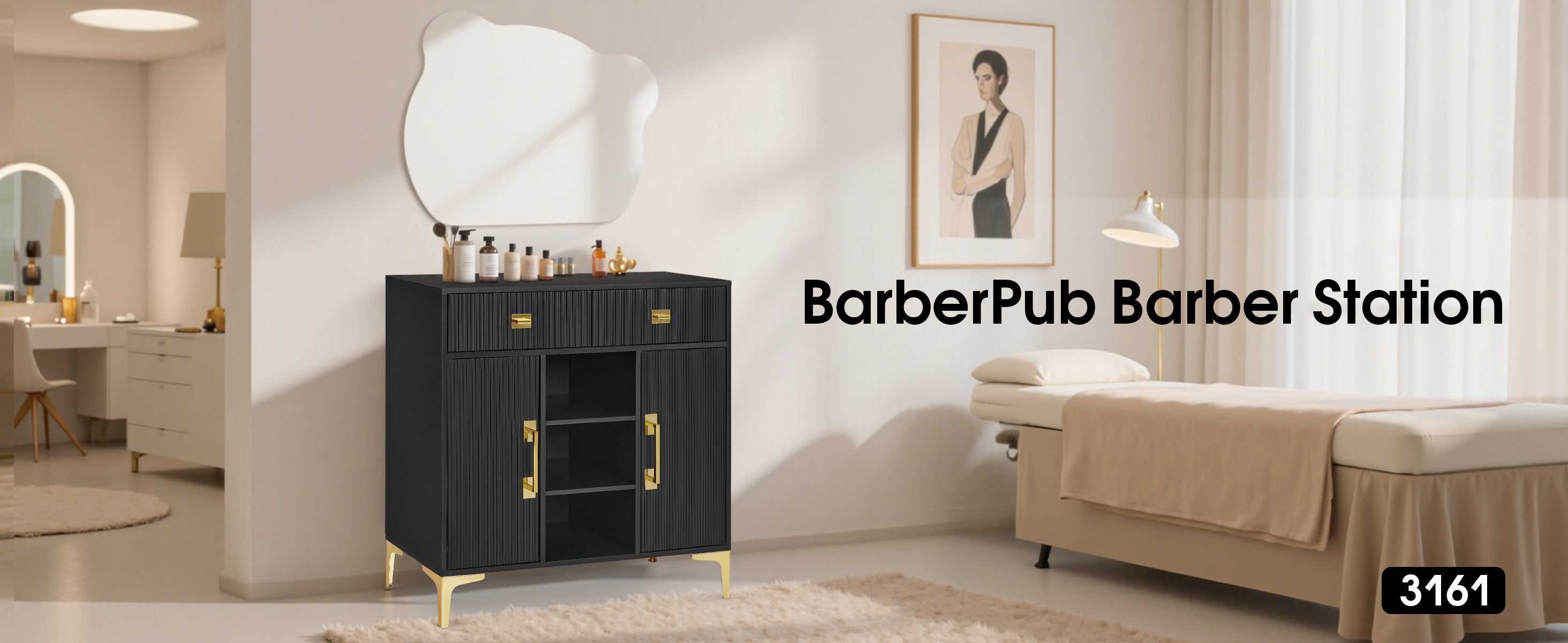 [Elegant Fluted Design]: Doors and drawers display a refined vertical wave texture for a stylish, modern appeal. Golden metal handles and legs enhance the upscale feel, making it a standout piece for luxury salons, nail studios, or massage rooms.