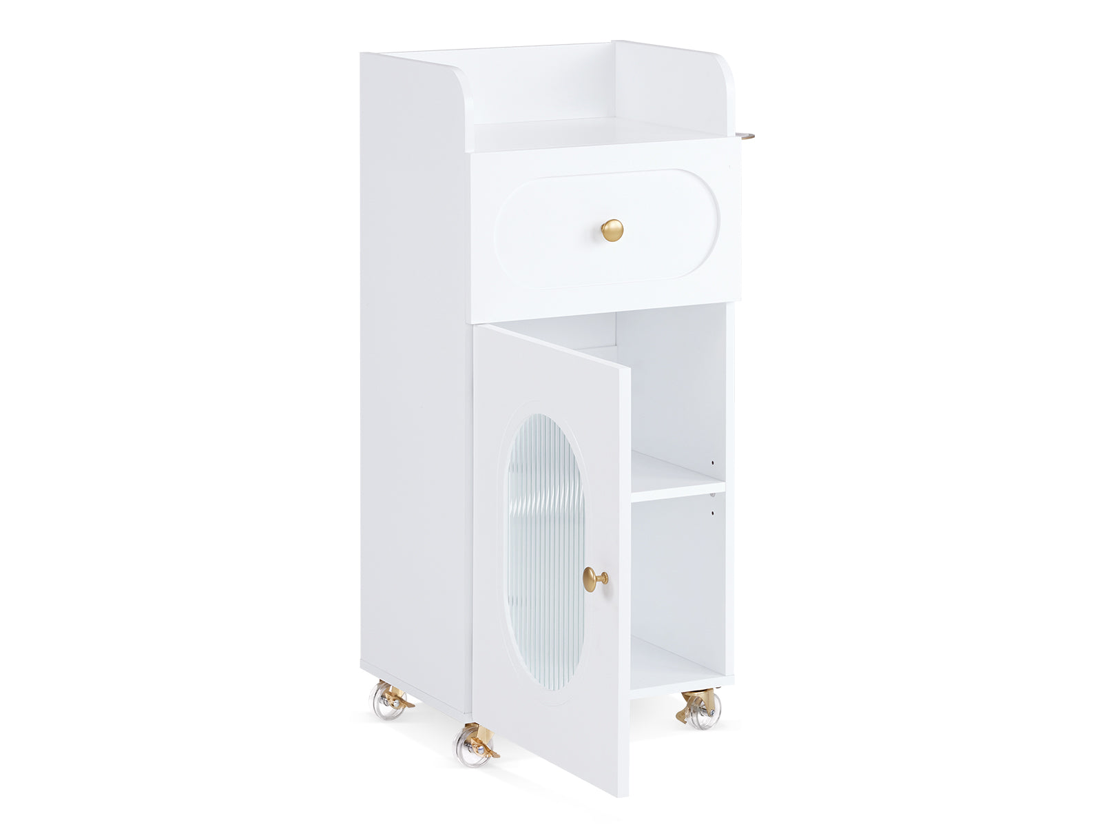 Elevate your salon organization with this chic and sleek glass-fronted salon trolley. Crafted with a sleek white paint finish, it effortlessly blends into any decor. The top drawer and a reeded glass-front cabinet keep your tools and products organized and within reach. Mounted on smooth-rolling casters, this salon trolley is easy to move around as needed. With its stylish design and practical features, this versatile piece is a must-have for professional salon settings or beauty enthusiasts seeking elegance and functionality.