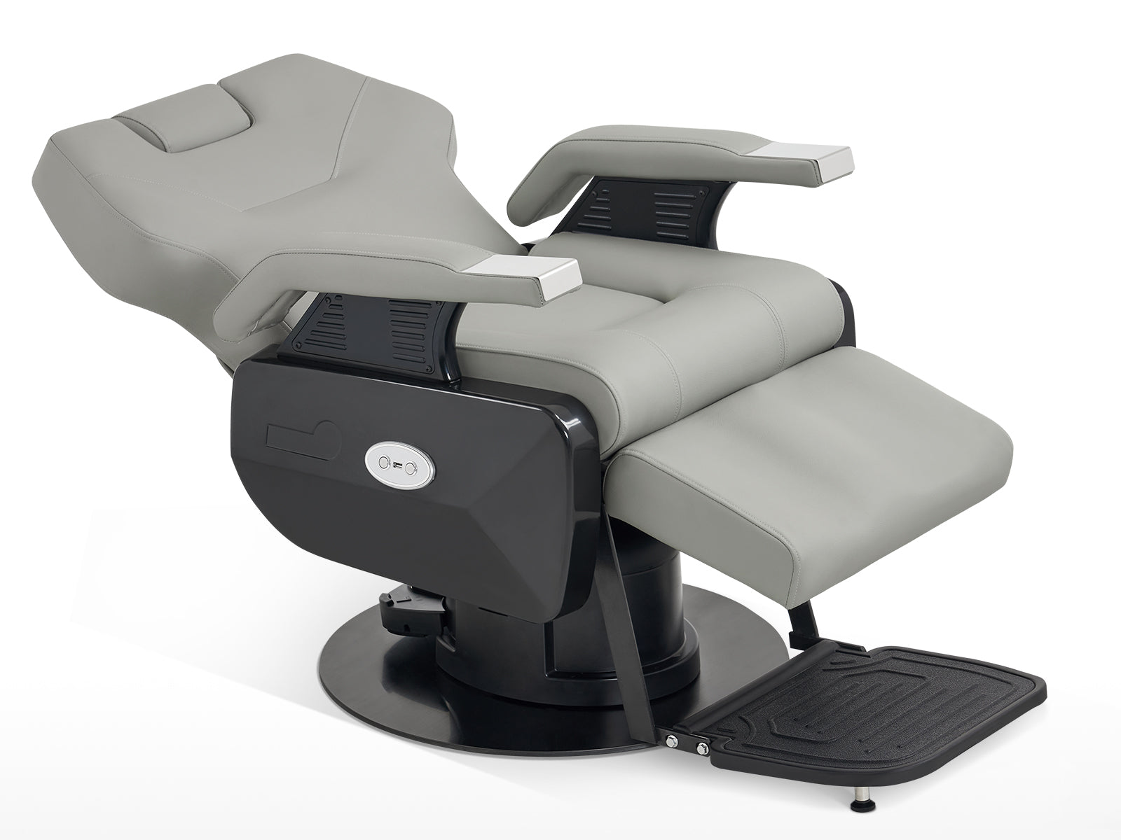 The electric drive mechanism operates smoothly and quietly, allowing barbers to effortlessly adjust the chair's height and recline the backrest. Upholstered in high-quality artificial leather and filled with high-density foam, this chair offers customers a relaxing and comfortable experience.