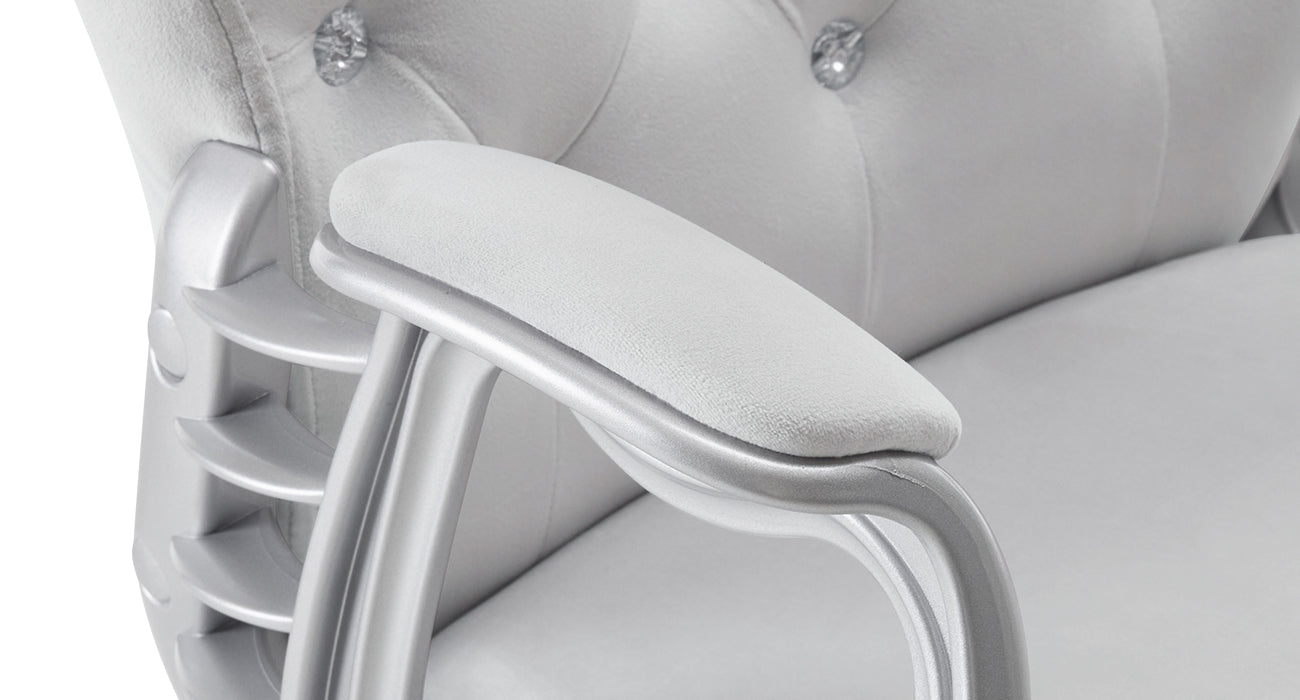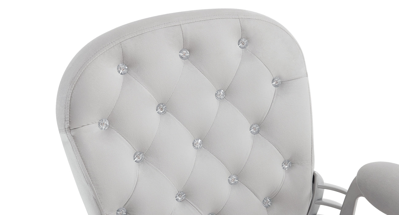 Our nail tech chair, adorned with a crystal button-encrusted backrest and featuring a plush seat cover, offers a fully padded cushion for ultimate comfort. The metal base adds a touch of elegance while ensuring stability. Designed with both the nail artists and nail customers in mind, this salon chair combines ergonomic support with stylish aesthetics for a truly luxurious salon experience.
