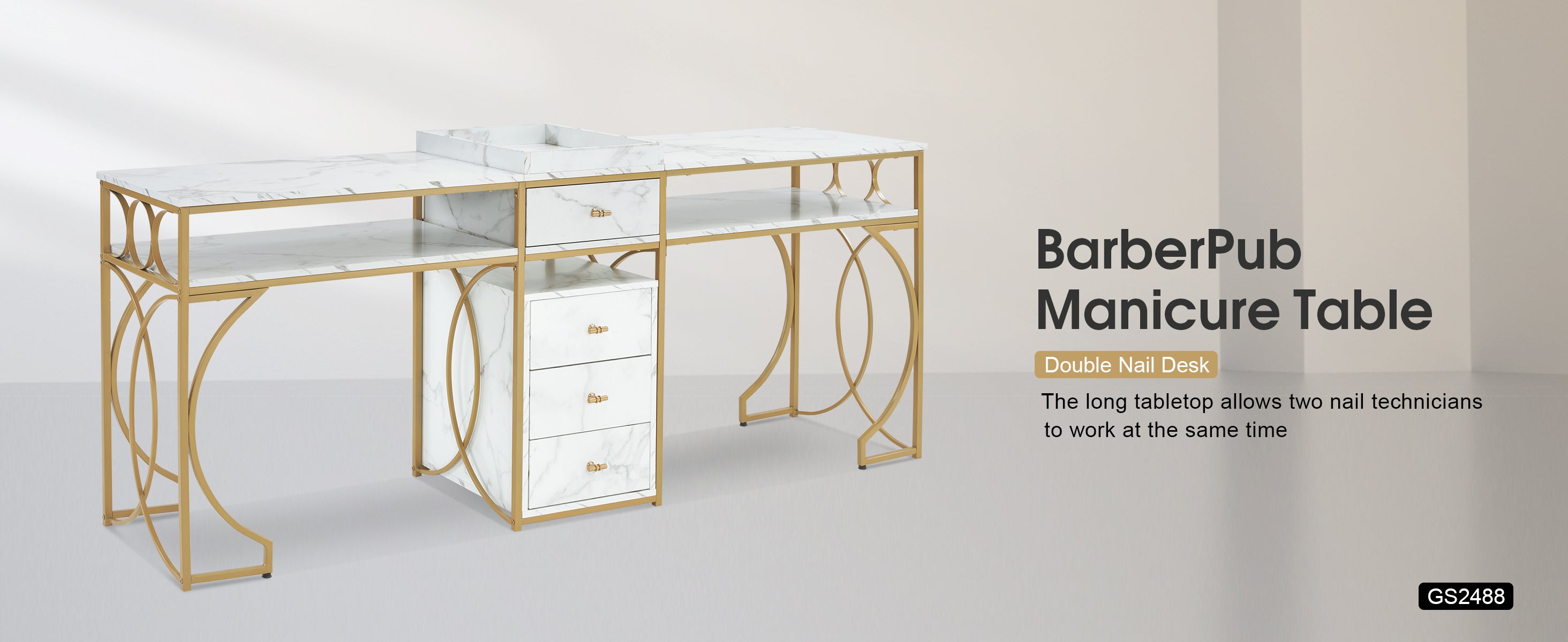 BarberPub Double Manicure Table, Marbling Textured Nail Station for 2 person 2488