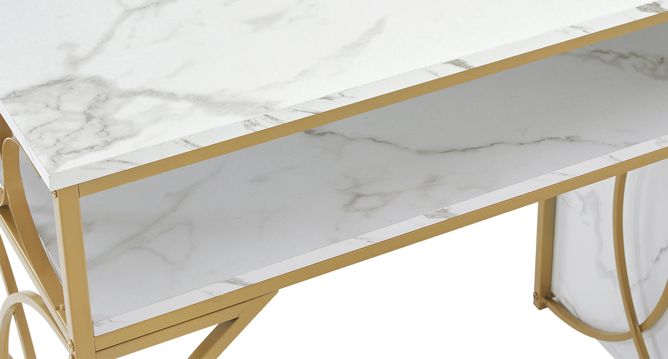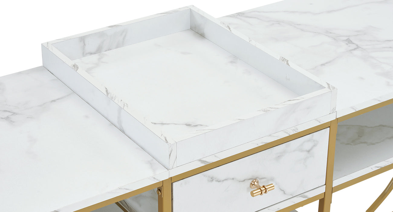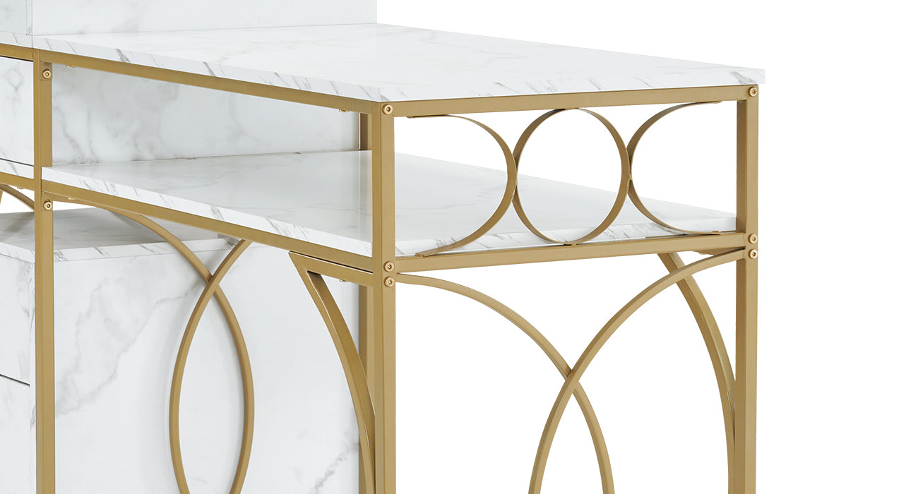 [Sophisticated Aesthetics]: The manicure table combines marbling panels with sturdy metal frame, coming with beauty and durability. The gold metal frame with its curved hollow design not only adds a luminous touch but also elevates the salon's overall ambiance.