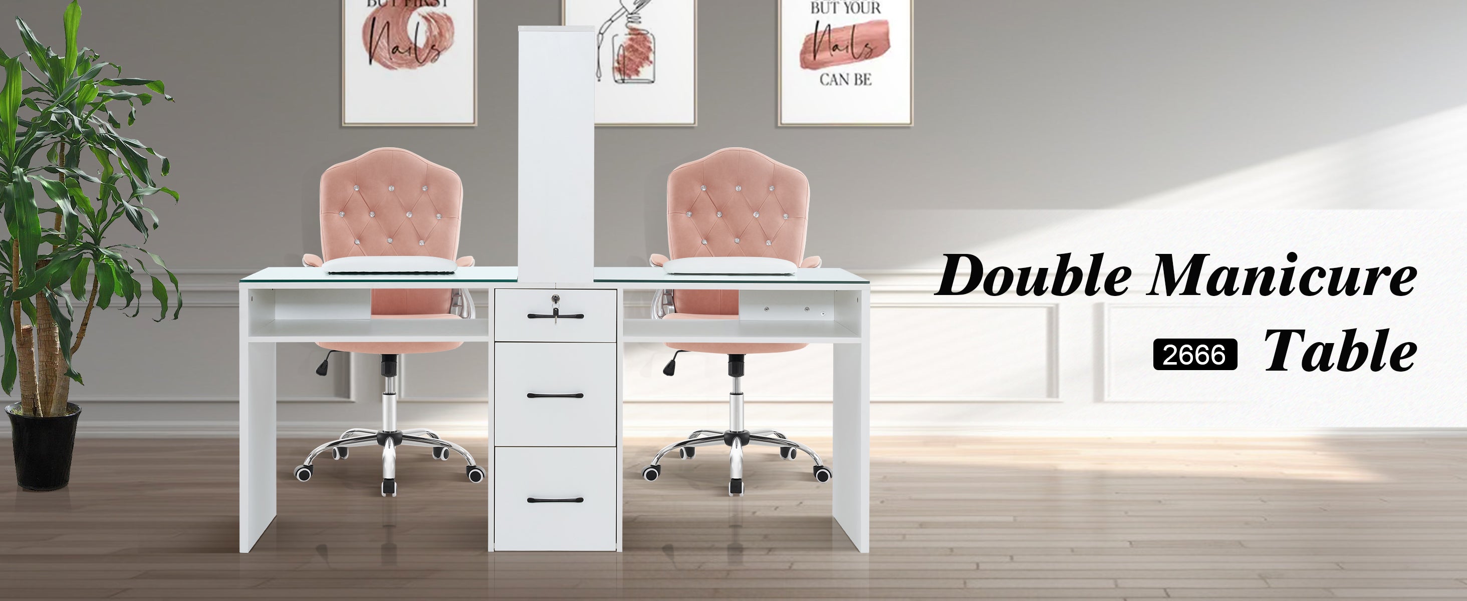 • Premium Material: Made of high-quality particle board and tempered HD glass, this double manicure table boasts a desktop that not only offers a sleek and durable surface but also presents a beautiful appearance. With its specially designed wrist rest, it ensures customers enjoy a comfortable experience.