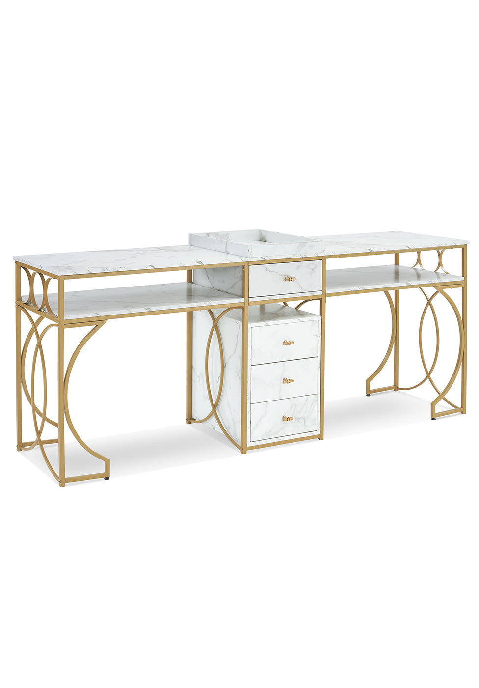Combined breathing marbled pattern with vibrant golden lines and stripes, the nail table is modern, solid and one of a kind. With an innovative built-in power strip, this manicure table will be a multifunctional workstation, catering to a variety of needs.