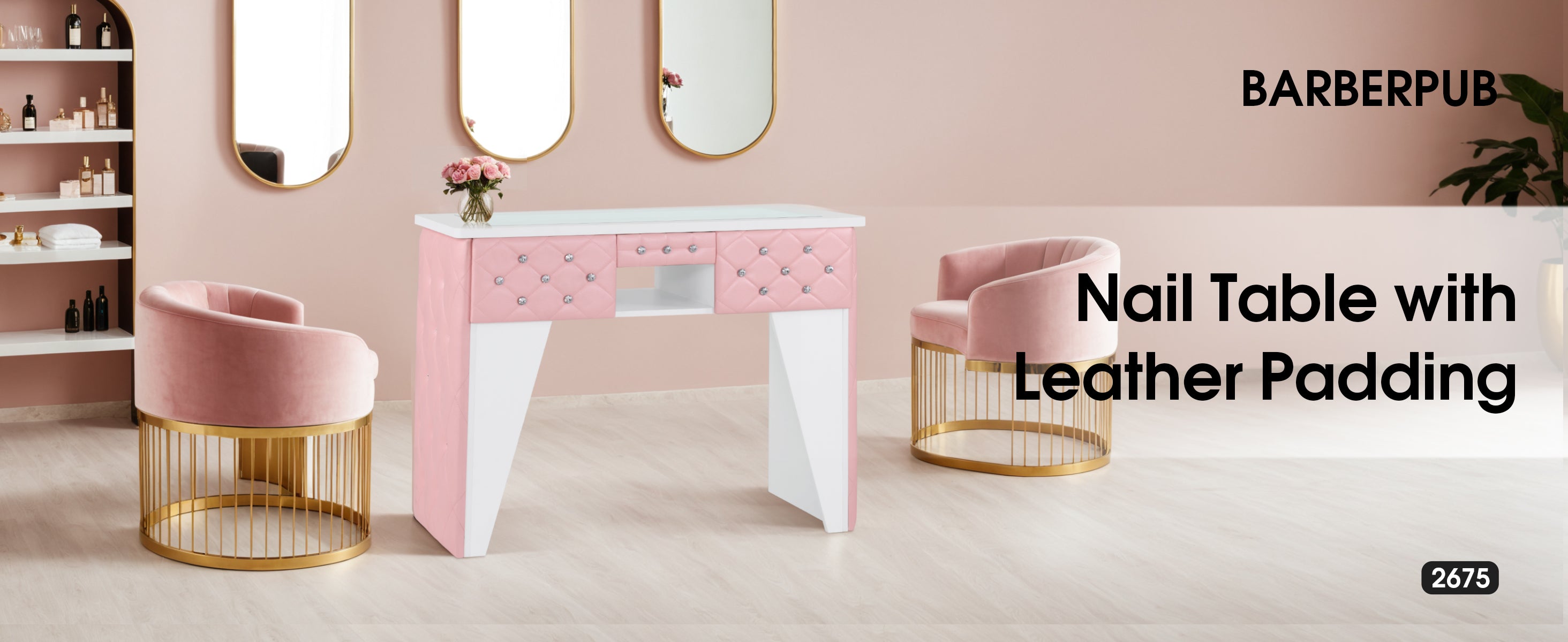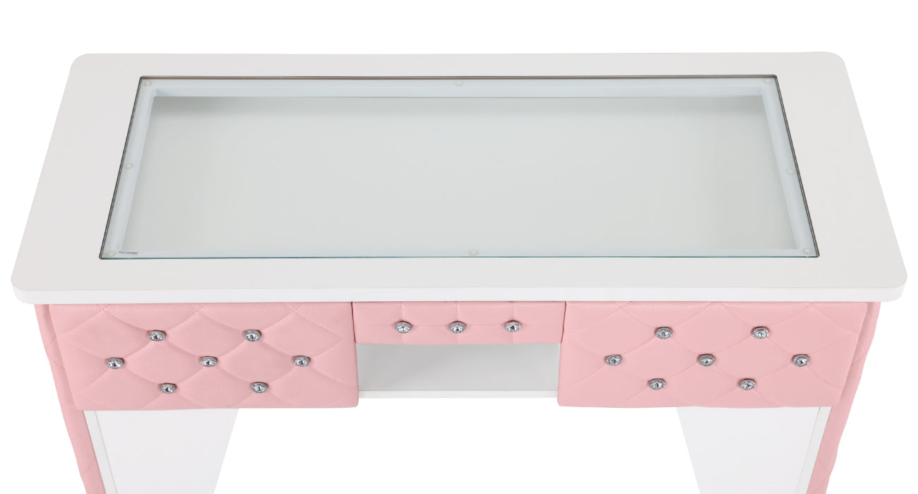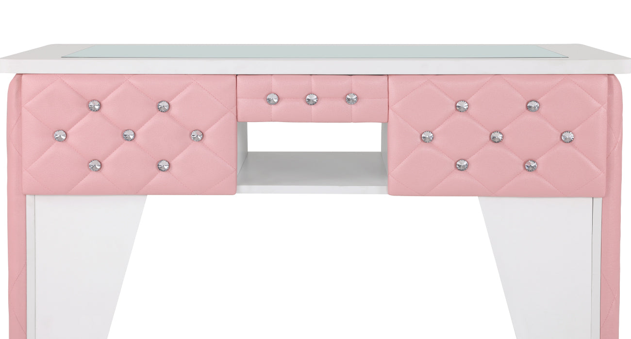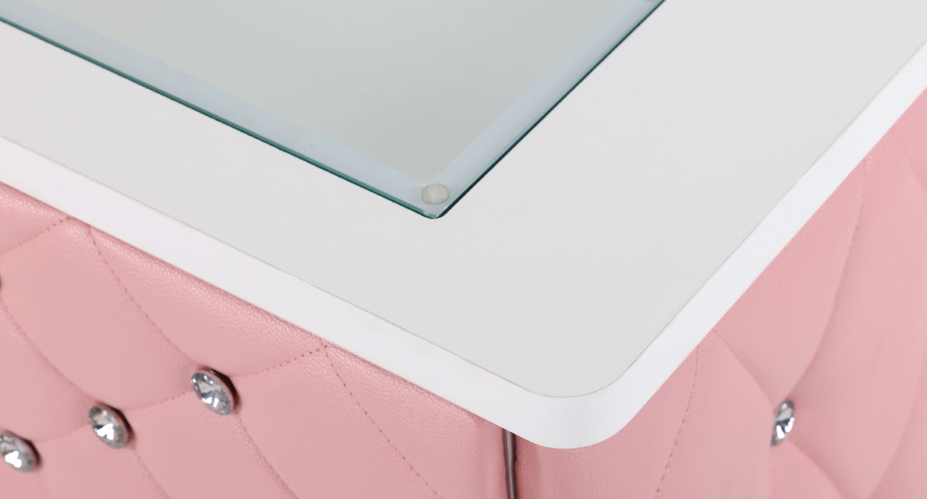 [Chic Pink Upholstery]: The leather-cushioned section features soft pink upholstery with a diamond-patterned design and crystal-like button accents, adding elegance and glamour to your nail station. The smooth, subtly shiny material enhances its refined, sophisticated look of any beauty salon.