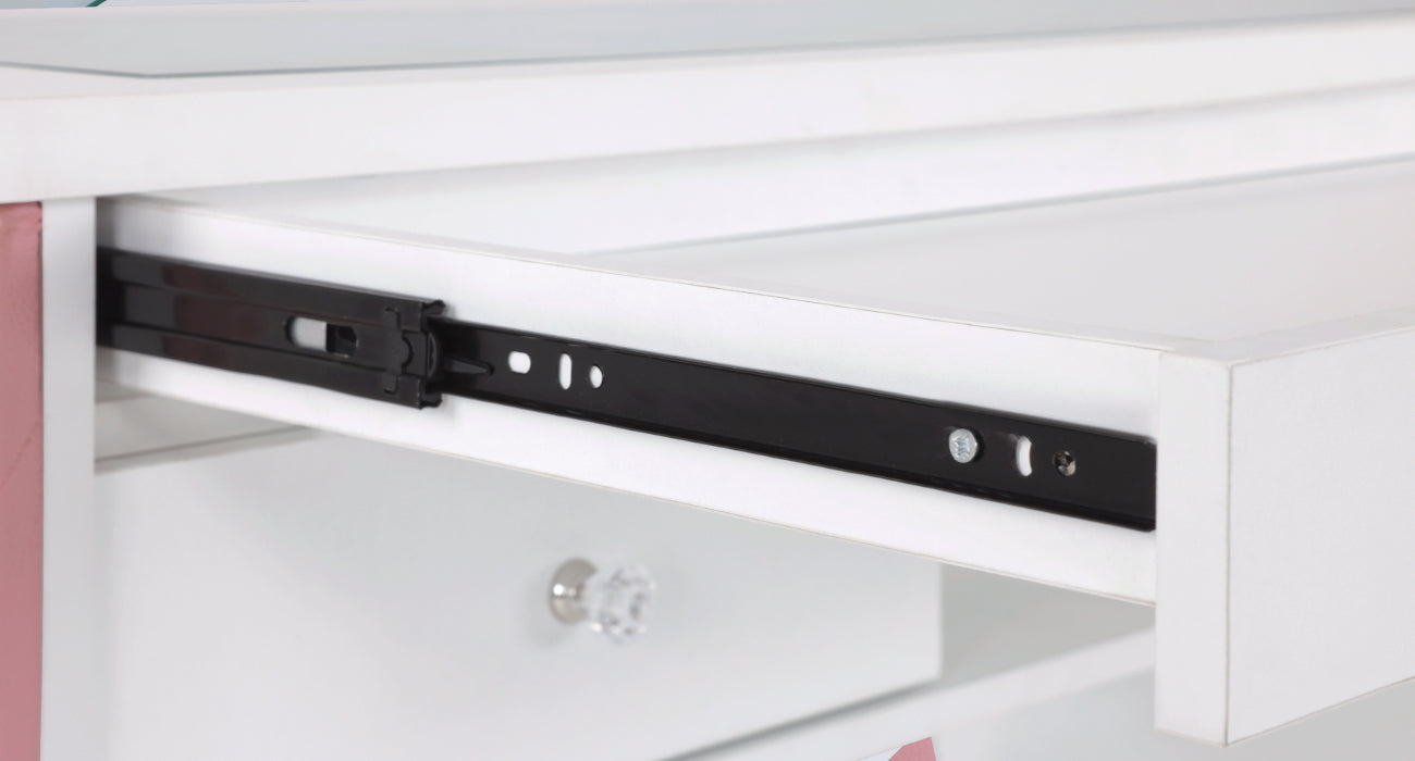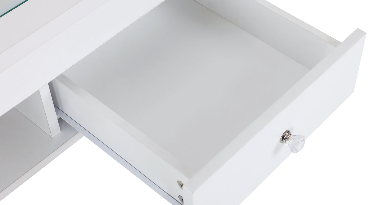 [Embedded Glass Tabletop]: The embedded glass tabletop offers a clear view into the central drawer, optimal for displaying nail polish collections, nail art tools or decorative items, enhancing the nail table's aesthetic appeal in nail salons.