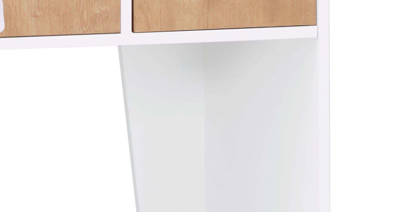This nail table is a harmonious blend of aesthetics and practicality, featuring a thoughtfully designed dual-sided storage system, an efficient dust collector, and transparent glass shelf for offering a full view into the drawer below. Its contemporary design, with a combination of white and teakwood tones, makes it an appealing addition to upscale nail salons and other beauty studios.
