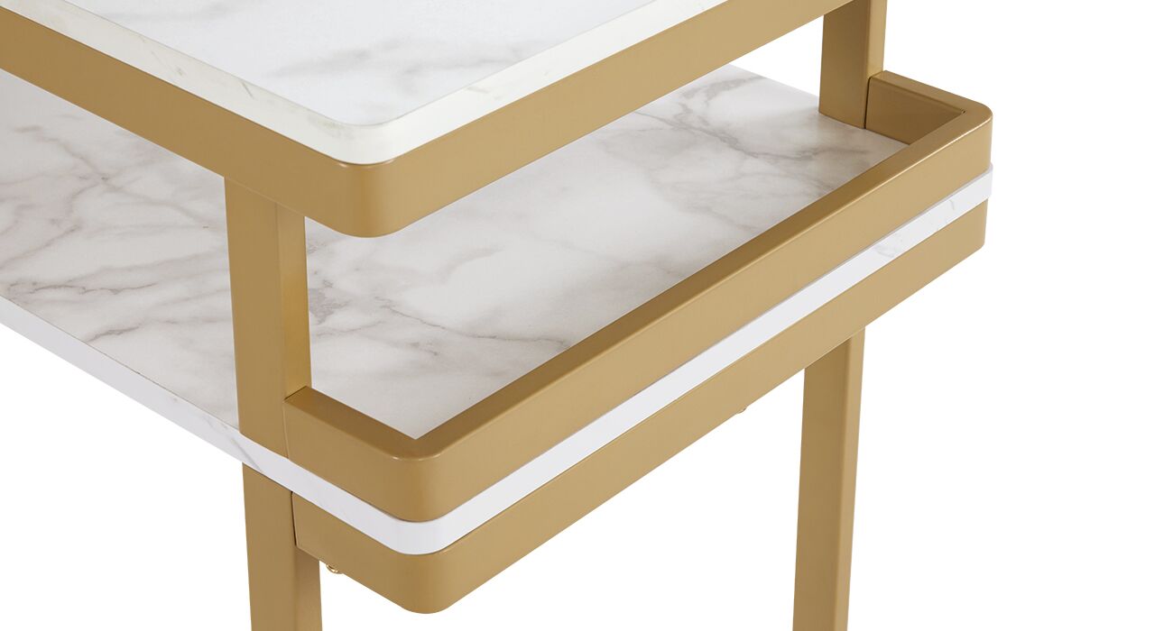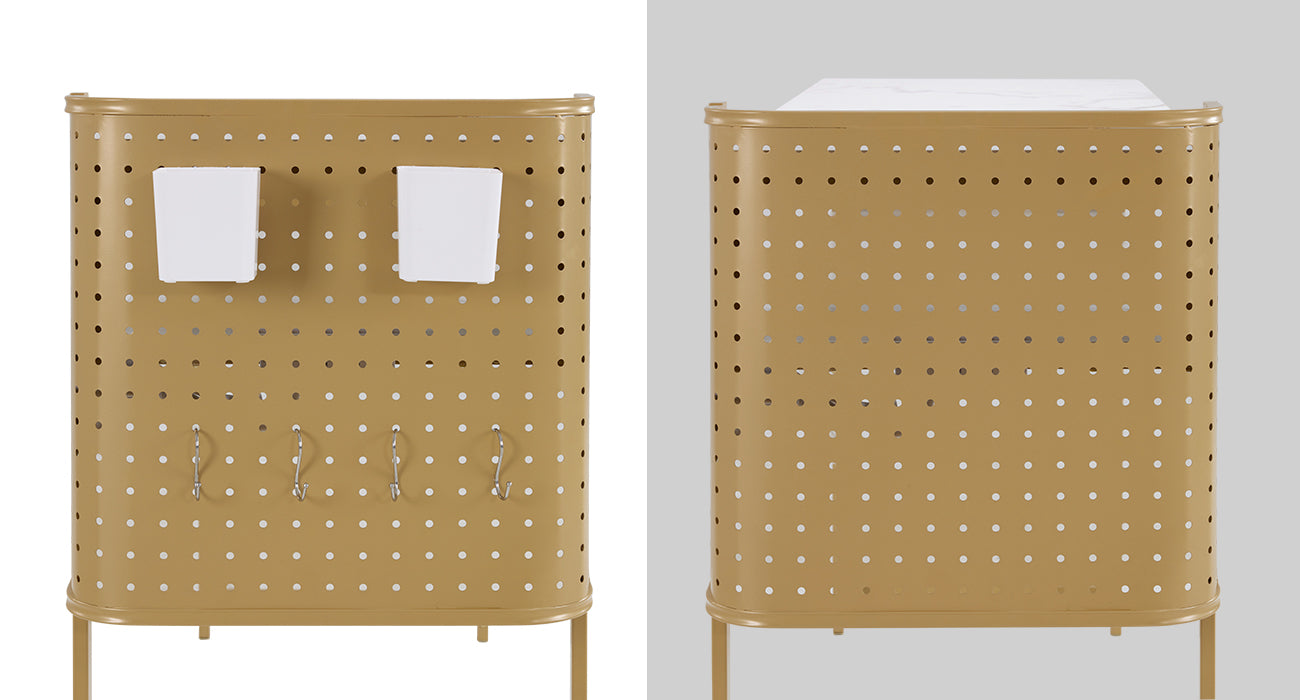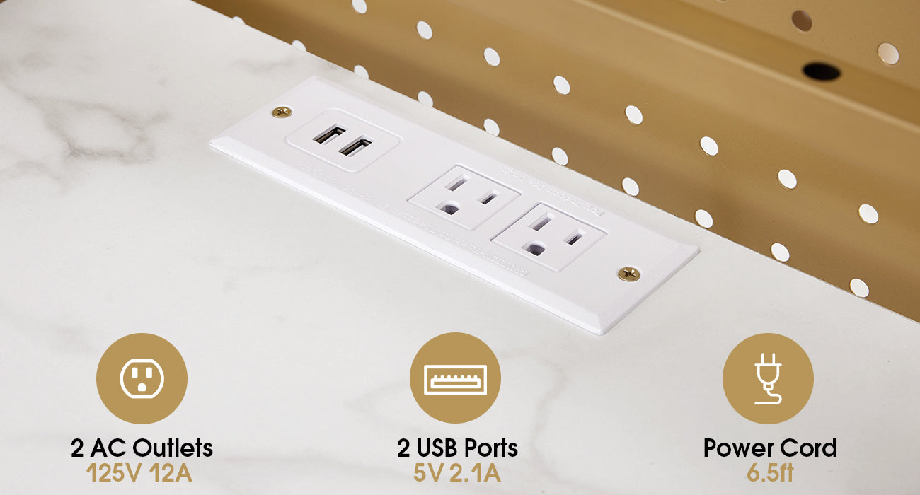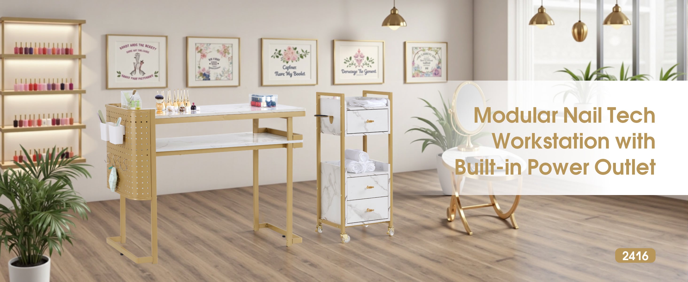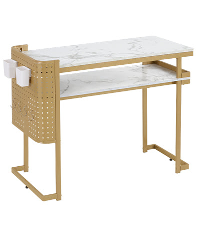 This nail table blends modern style with practical features, featuring a particleboard top and a gold metal frame. The side perforated panel allows flexible arrangement of hooks and cups for organized tool storage. A second-tier shelf provides extra space, while built-in 2 AC outlets and 2 USB ports keep devices powered for efficient nail services.