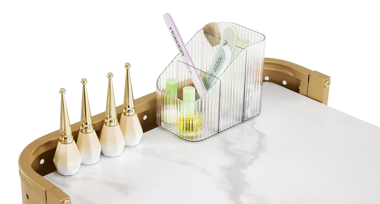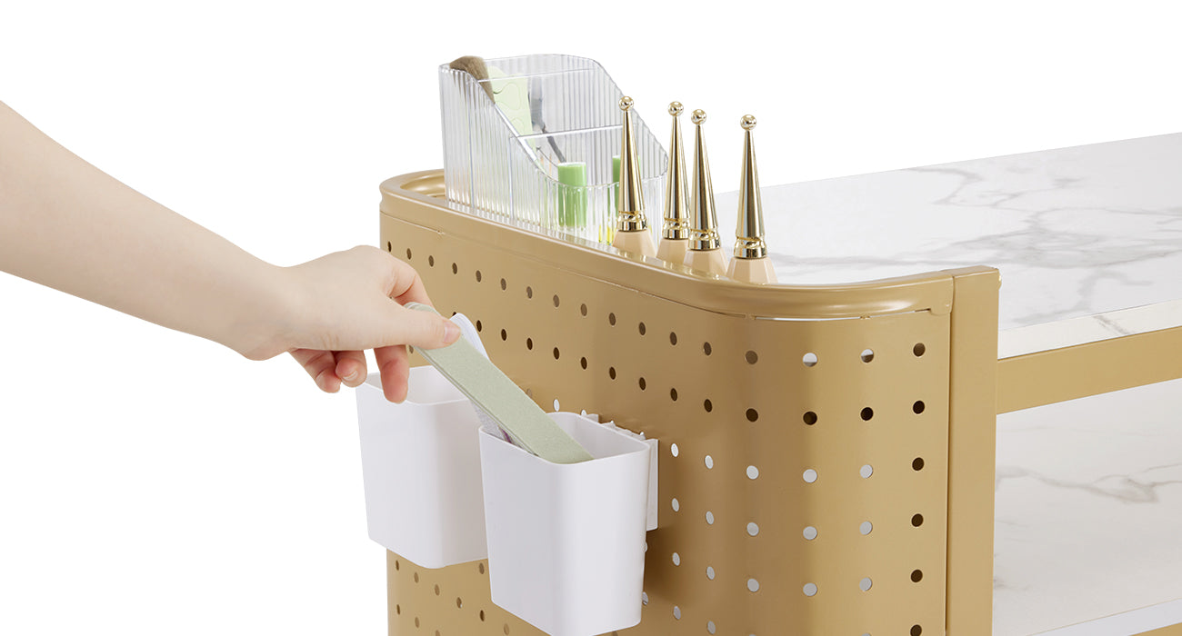This nail table pairs modern elegance with practical design, featuring a marble-patterned surface and a golden metal frame. The rounded corner design enhances safety, while the dual-tier structure maximizes workspace efficiency. A perforated side panel with hooks and detachable cups keeps tools within reach, and built-in outlets with USB ports provide reliable power access - perfect for professional and home nail setups.