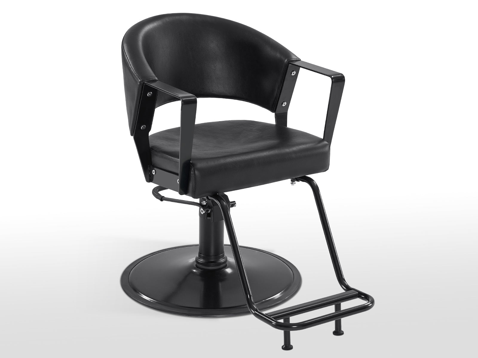 In an exquisite beauty salon, a striking all-black heavy duty salon chair stands out among the rest. Placed at the center of the hairdressing room, it exudes an air of elegance. The salon styling chair features a clean and minimalist design, with the black base and iron frame.