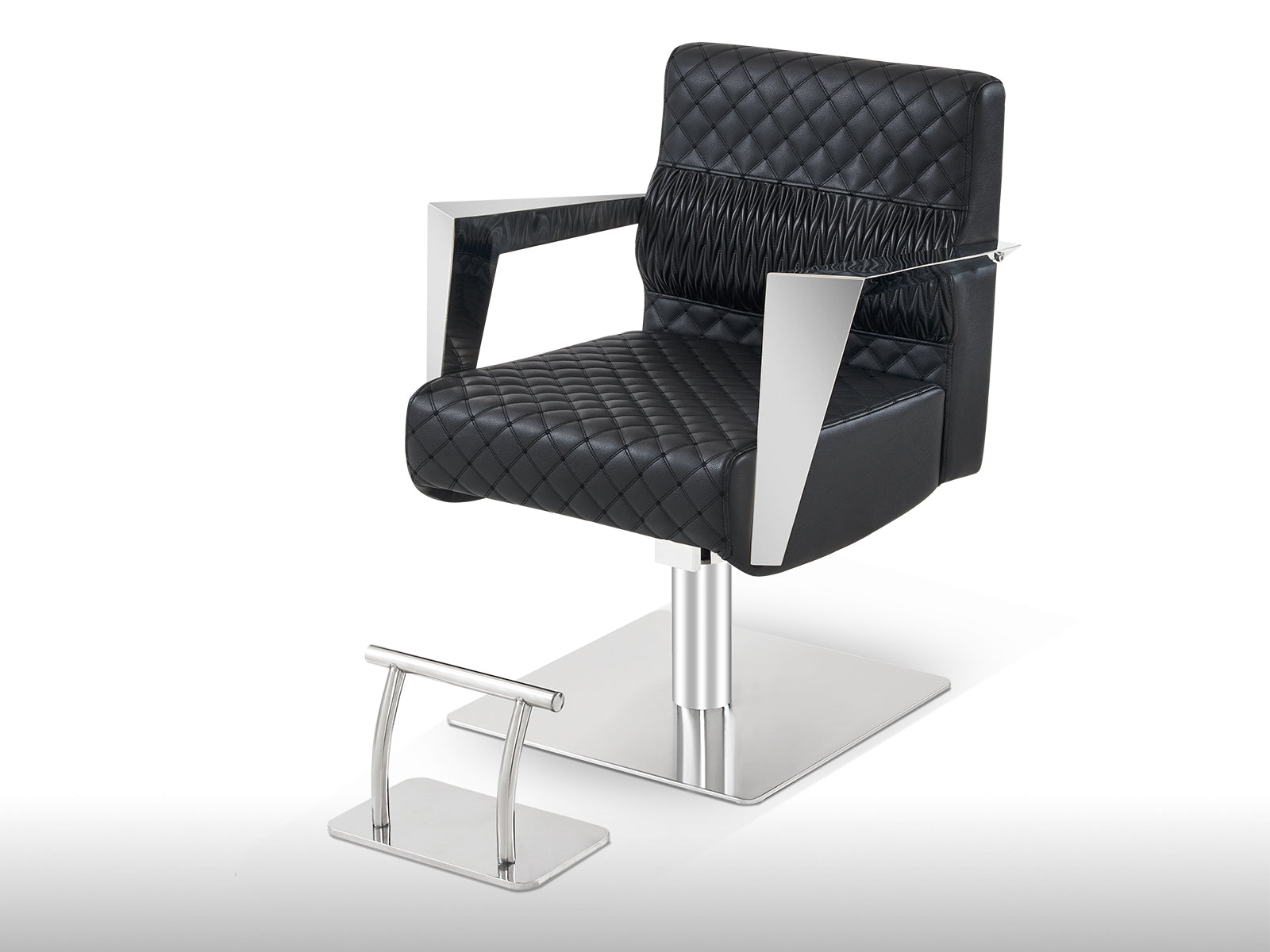 This hair stylist salon salon chair combines Crinkled leather and matte leather materials, along with a geometrically irregular stainless steel armrest design that not only emphasizes aesthetics but also durability. When customers sit in the chair to start their hairdressing experience, they can rest their feet on the movable independent footrest, allowing their legs to naturally bend and providing a relaxed and comfortable posture during beauty or hairstyling sessions. This hairstylist salon chair is not just a functional tool; it's also a piece of decoration, adding sophistication and modernity to your beauty space.