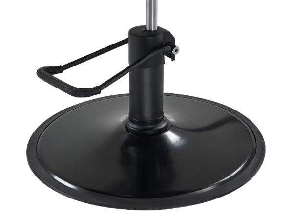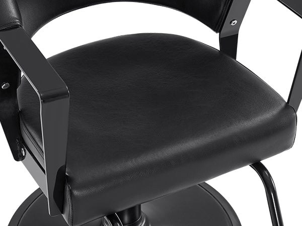 In an exquisite beauty salon, a striking all-black heavy duty salon chair stands out among the rest. Placed at the center of the hairdressing room, it exudes an air of elegance. The salon styling chair features a clean and minimalist design, with the black base and iron frame.