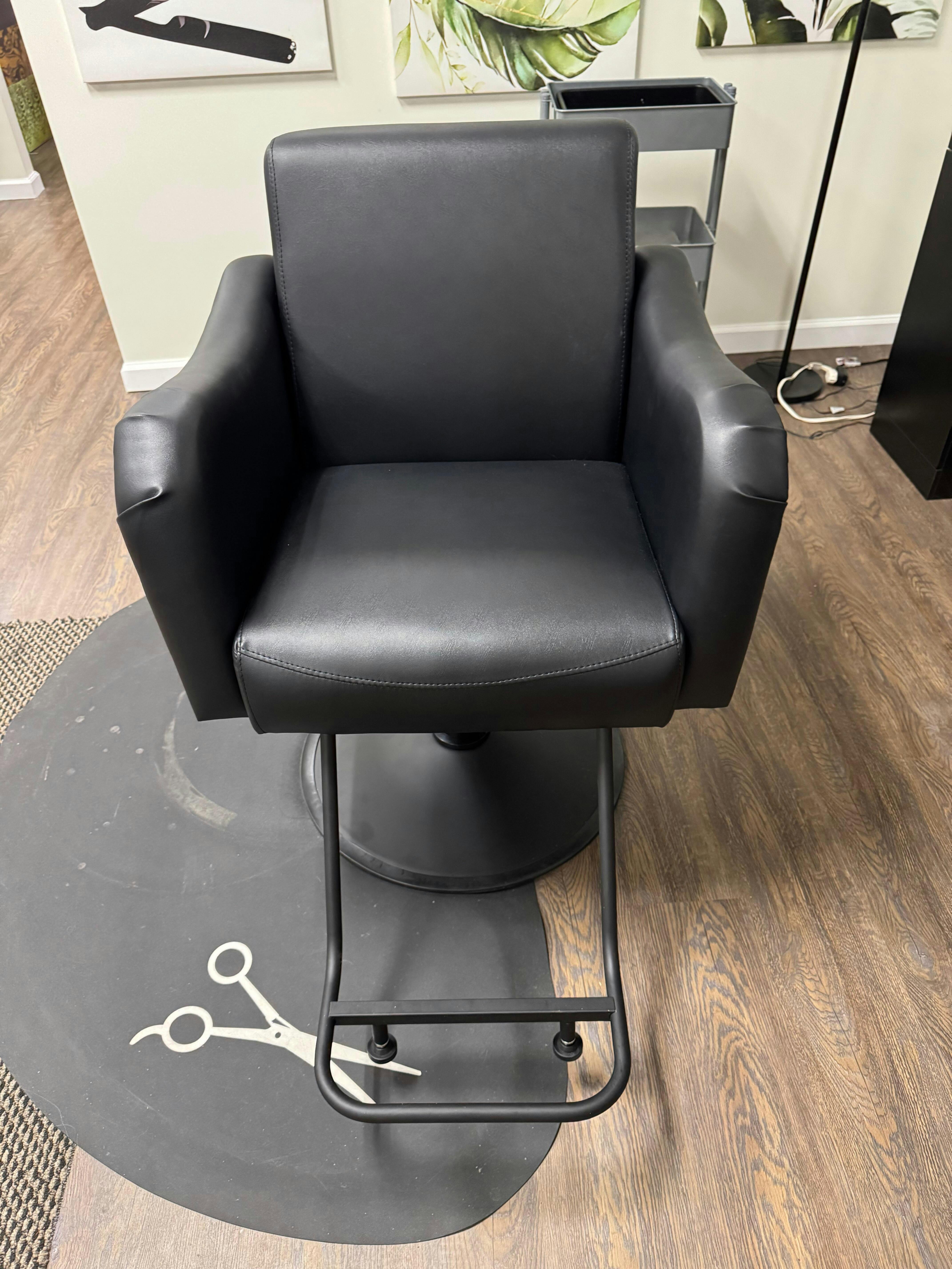 Enhance your salon setup with this all-black professional salon chair that blends comfort, function, and contemporary style. Built for hairstylists, barbers, and estheticians alike, this hair stylist chair features durable faux leather upholstery that resists spills and stains—perfect for busy salon environments. The wide cushioned seat and backrest provide exceptional comfort, while the fixed footrest and padded armrests keep clients fully supported.