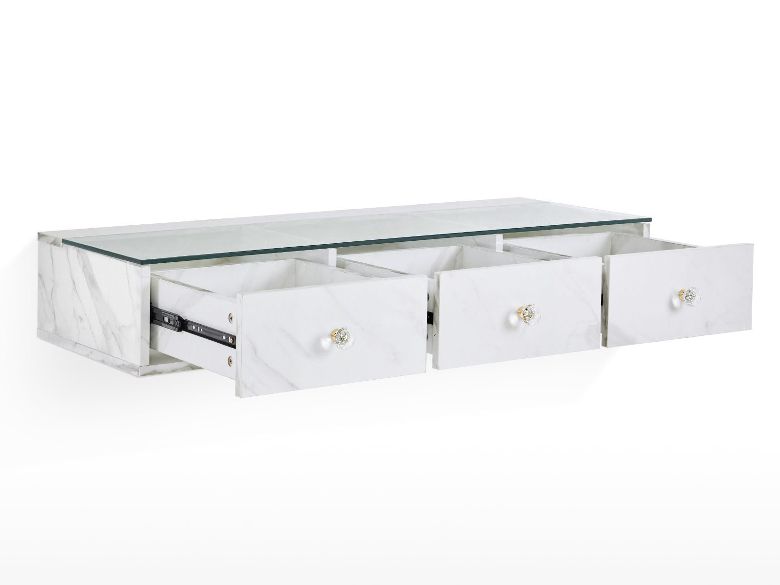 This minimalist wall-mounted station is a well blend of modern aesthetics and practical functionality. With its luxurious marble-like finish and attractive faux crystal handles, they add a touch of high class to the whole simple cabinet. Featuring 3 spacious drawers for organized storage, it's more than enough for your daily storage needs. Durable and versatile, this storage styling cabinet is an excellent choice for professionals looking to elevate both their decor and efficiency.