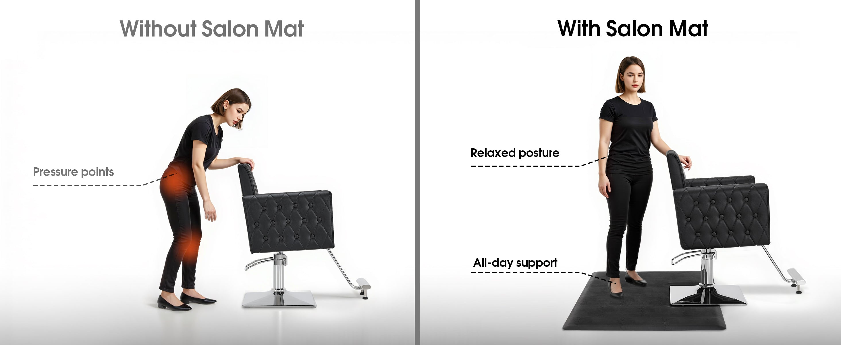 [Ergonomic Support]: The thick, resilient foam core effectively reduces pressure on feet, legs, and back. Its ergonomic design helps stylists maintain better posture and stay energized through long working hours.