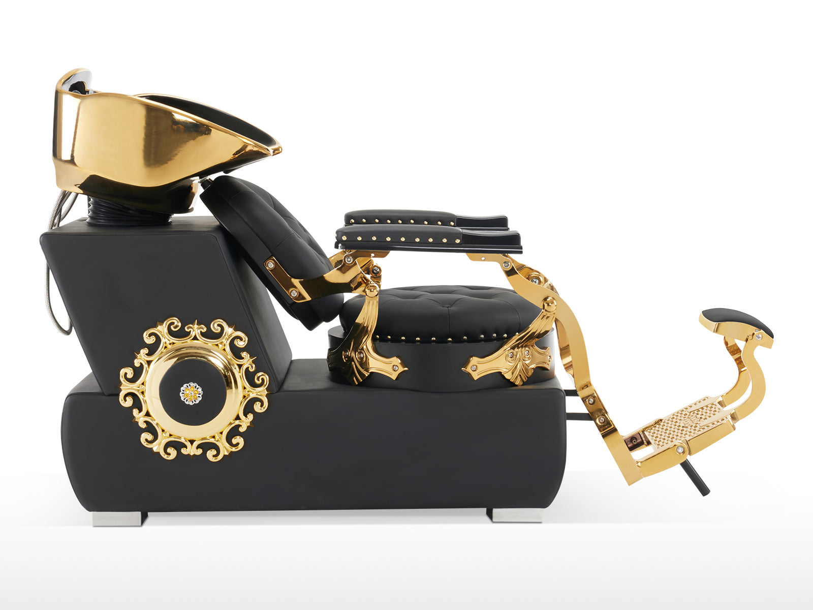 - Porcelain Shampoo Bowl: The gold-plated finish on the porcelain sink adds luxurious detailing that enhances its aesthetic appeal. The porcelain basin can be adjusted to the suitable position as required and is equipped with a neck protector to allows customers to relax their neck.