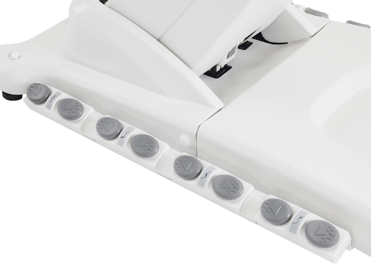 Crafted from premium PU leather and high-density foam, it offers superior comfort and durability. With a robust weight capacity of 400 lbs, it accommodates a wide range of clients. The interchangeable dual headrest adds versatility, while four electro-hydraulic motors ensure smooth adjustments to the backrest, leg rest, height, and tilt.