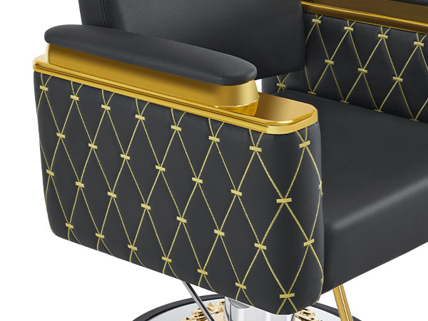 The striking cross gold stitching design further enhances the overall sense of fashion and individuality, adding a touch of sophistication and elegance. No matter what style, these salon chairs are equipped with a gold-plated iron frame, which is durable and has a base decorated with gold plastic flowers, which enhances the overall exquisiteness. The golden frame design on the armrest not only provides comfortable support for customers, but also adds a sense of luxury.