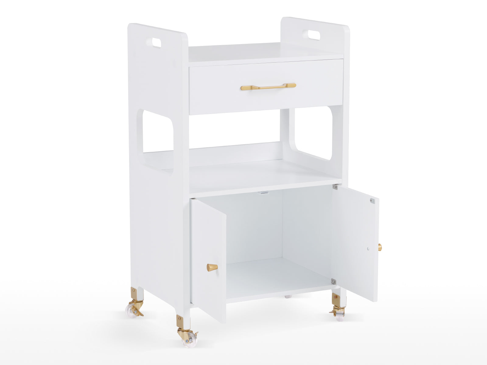 This salon mobile trolley is a well-designed, multifunctional storage organizer. With its sleek all-white finish, exquisite gold handle and knobs, smoothly curved corners and various spaces for storage, the beauty cart offers a balance of aesthetics and practicality. It is an excellent addition to salons, SPAs, clinics and other service-oriented environments.