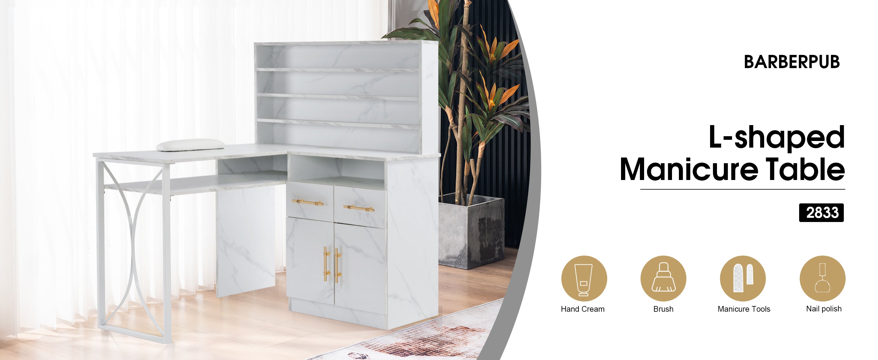 BarberPub L-shaped Nail Desk, Versatile Manicure Table with Metal Support 2833