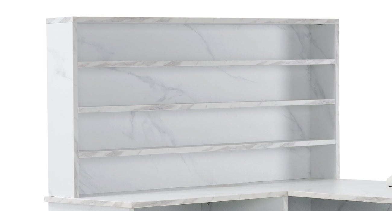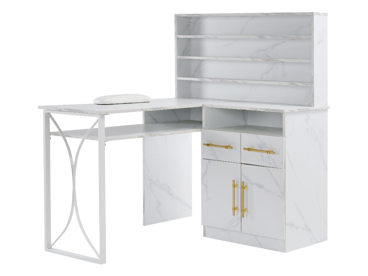 Categorized Storage: This nail station features 1 spacious L-shaped desktop with a double-layer design, 4 open shelves, 2 drawers, 2 cabinets and 1 small open space on the right, which provides ample space to organize supplies and provide designated spaces for tasks like nail preparation, polish application, and tool storage.