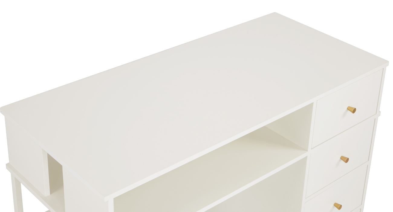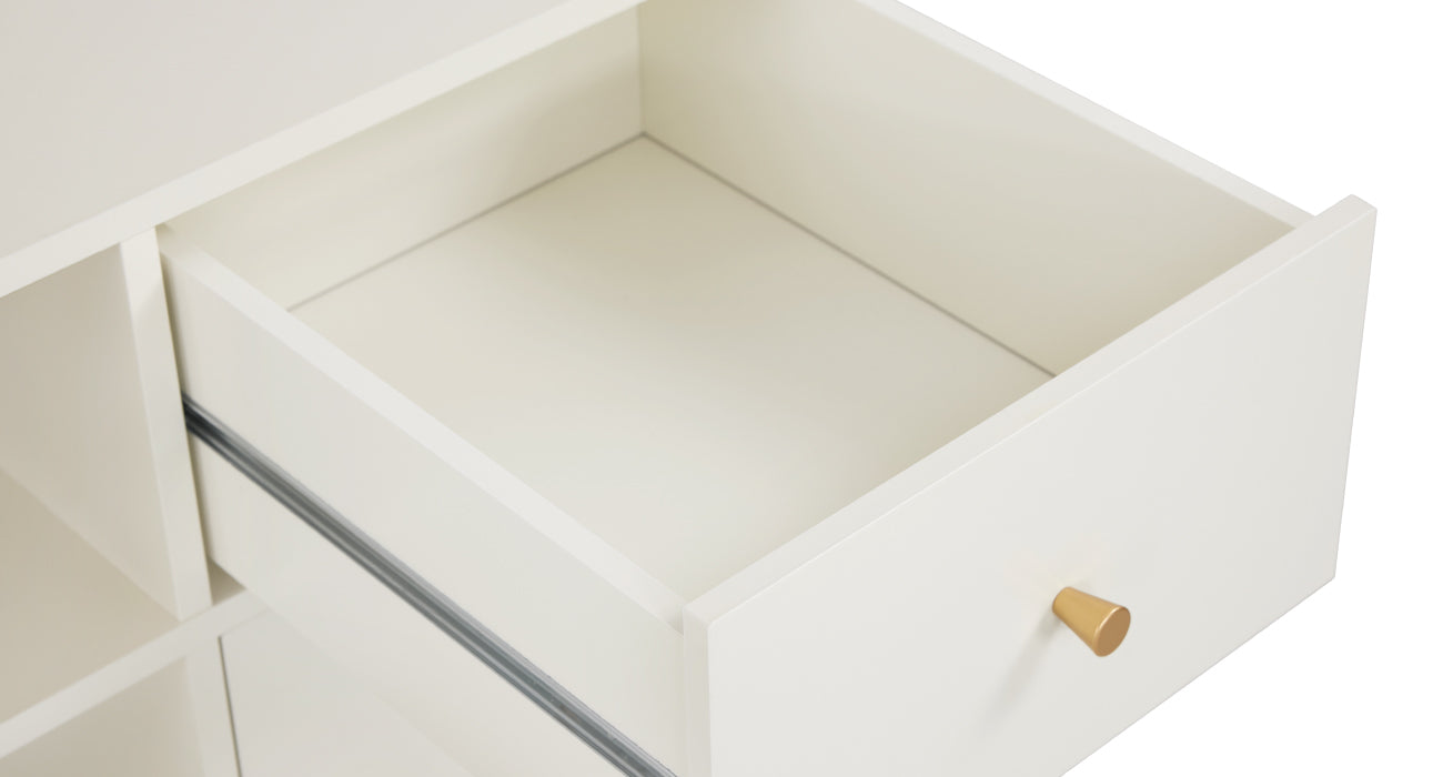 [Organized Storage]: It features 1 spacious desktop, 1 middle shelf, 4 drawers equipped with stylish brass-tone knobs, and 1 power and storage compartment, ideal for keeping a variety of nail tools, polishes, and accessories neatly stored and easily accessible.