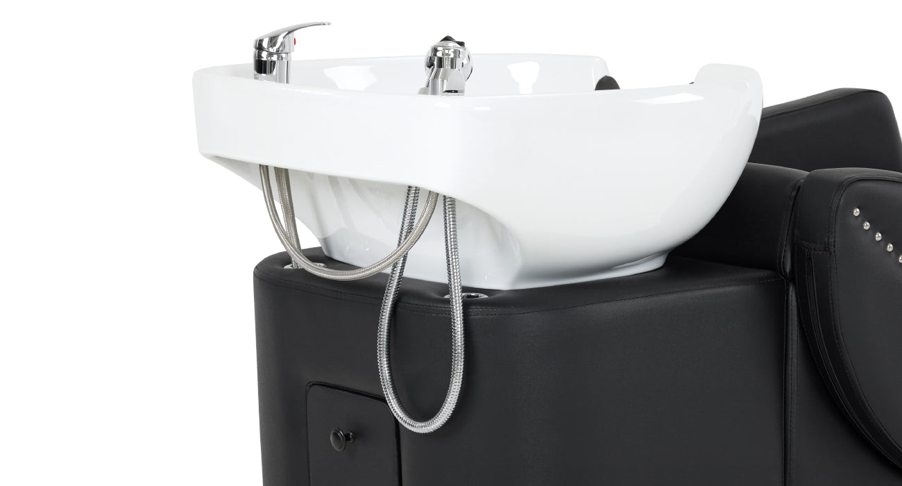The shampoo backwash sink station chair features a modern and elegant design. The backrest reclines at 162 degrees, paired with an independent footrest, allowing clients to lie almost flat for relaxation. And the ceramic bowl is equipped with a neck pillow and a head pad, ensuring comfort for the client's neck during hair washing sessions. The shampoo station chair is made of premium faux leather with rivet decoration for added sophistication. It will be the good partner for your barbershop, salon store.