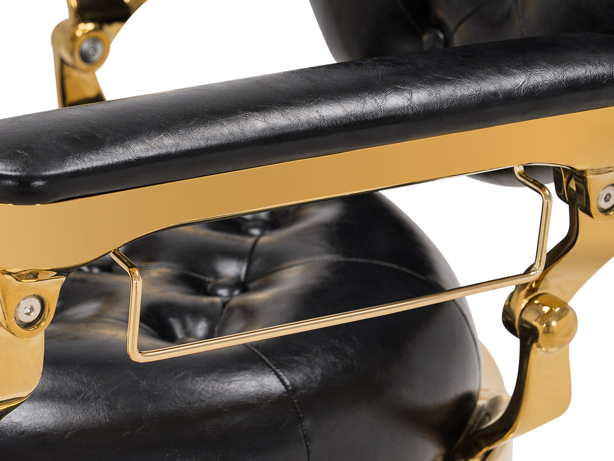 - Vintage Design: This reclining barber chair radiates luxurious vintage charm, enhancing the upscale aesthetic of your barbershop. The round backrest and seat cushion, adorned with button detailing, add a sophisticated touch to the overall design.